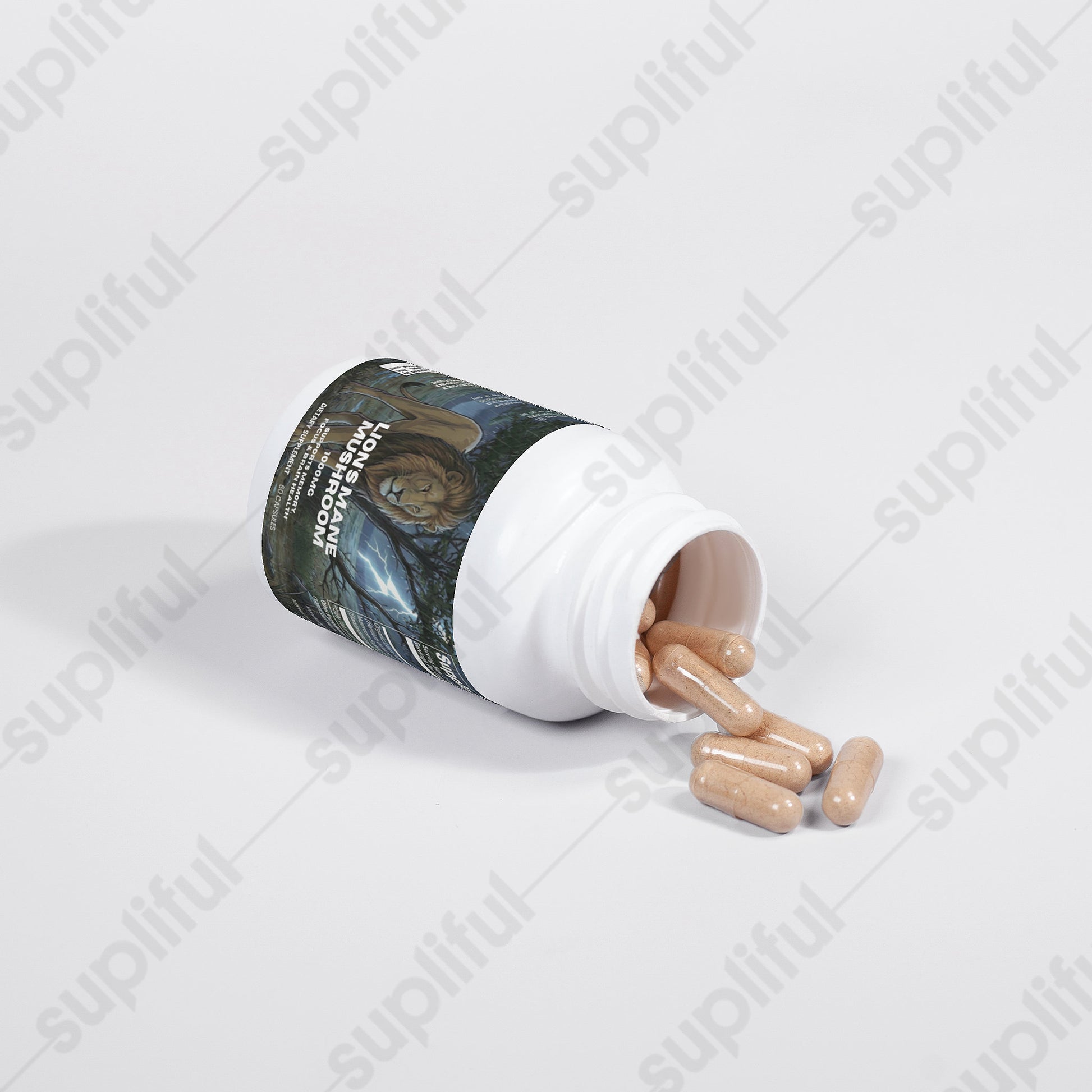 Ingredients: Organic Lion’s Mane (Hericum erinaceus) Mushroom Fruiting Body & Mycelium Powder (Standardized to 40% polysaccharides [400mg]), Organic capsule (pullulan, water), organic pea starch.